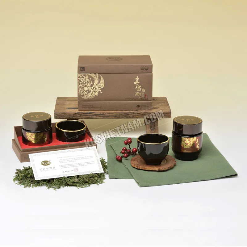 Thành phần: Cao Hồng Sâm cô đặc (Chất rắn hòa tan tự nhiên hơn 68%, tổng hàm lượng Ginsenoside Rg1, Rb1 và Rg3 là 10mg/g, Sâm Hàn Quốc 6 năm tuổi) 100%.
