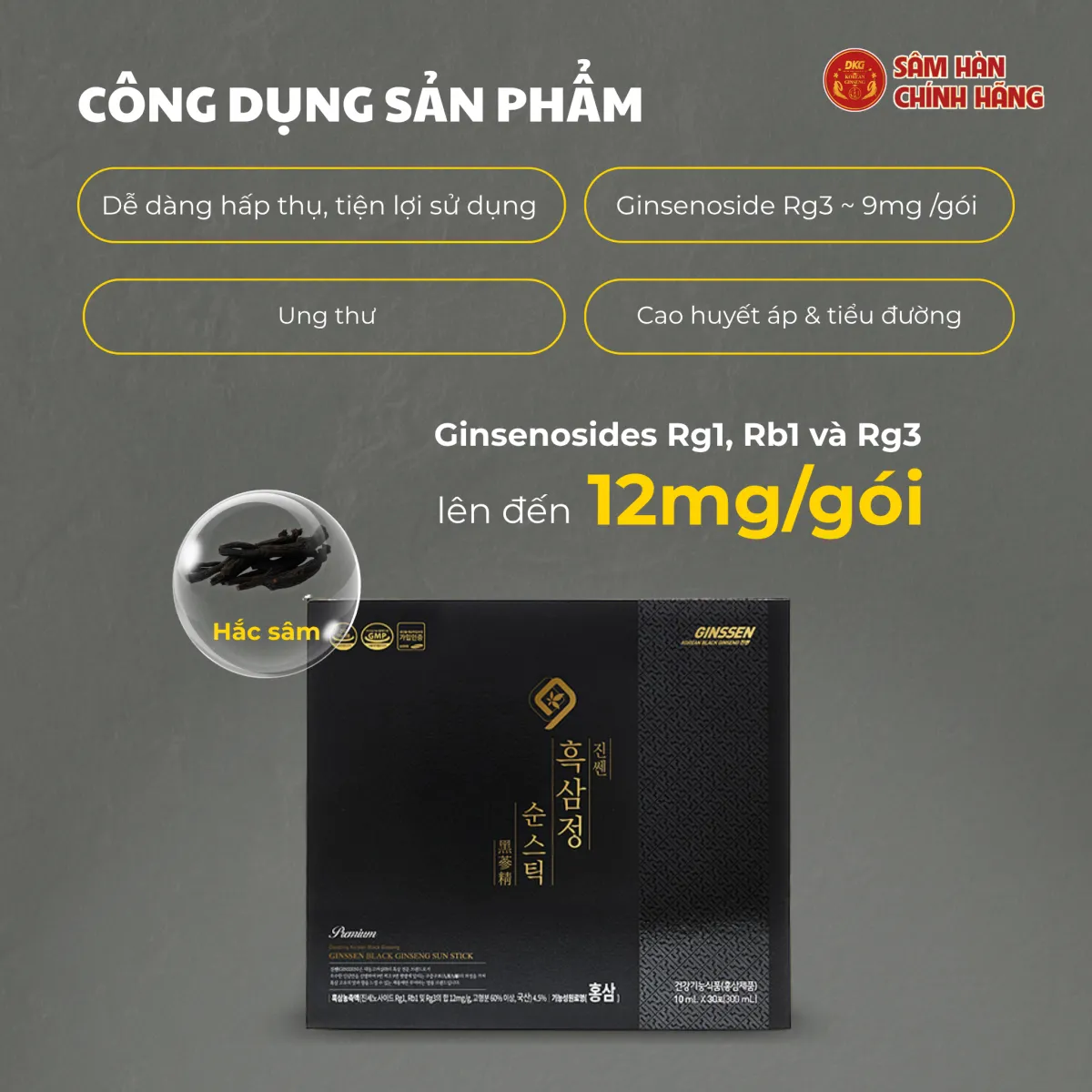 - Chiết xuất 100% từ hắc sâm Hàn Quốc 6 năm tuổi – tinh khiết, quý hiếm, hiệu quả cao.