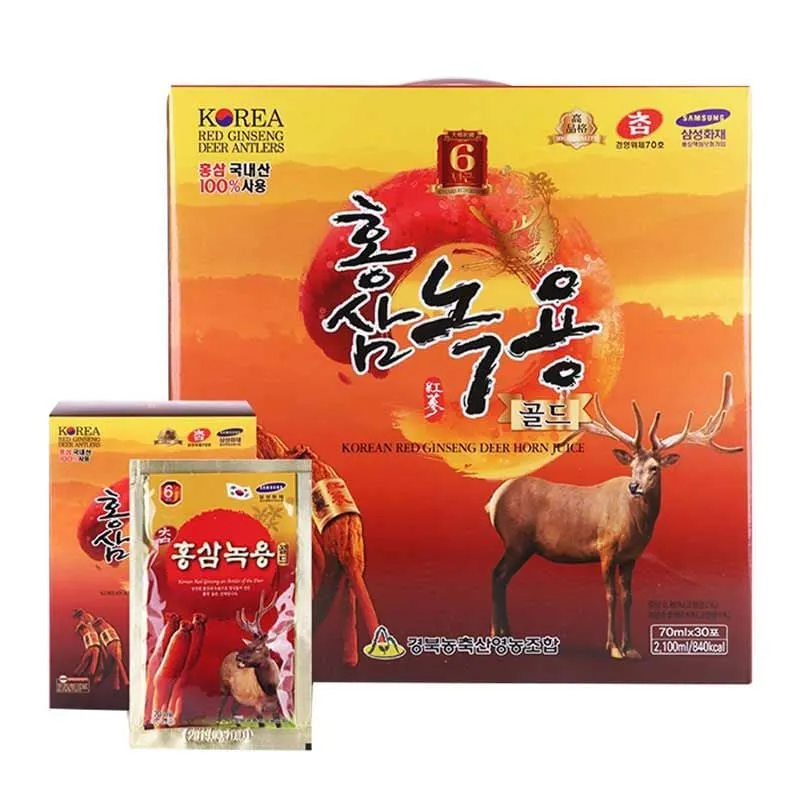 Nước Hồng Sâm Nhung Hươu Gyeongbuk 70ml x 30 gói là sự kết hợp giữa hồng sâm hàn quốc 6 năm tuổi, nhung hươu và các thành phần thảo dược khác giúp tăng cường sức khỏe, nâng cao hệ miễn dịch cho người sử dụng...
