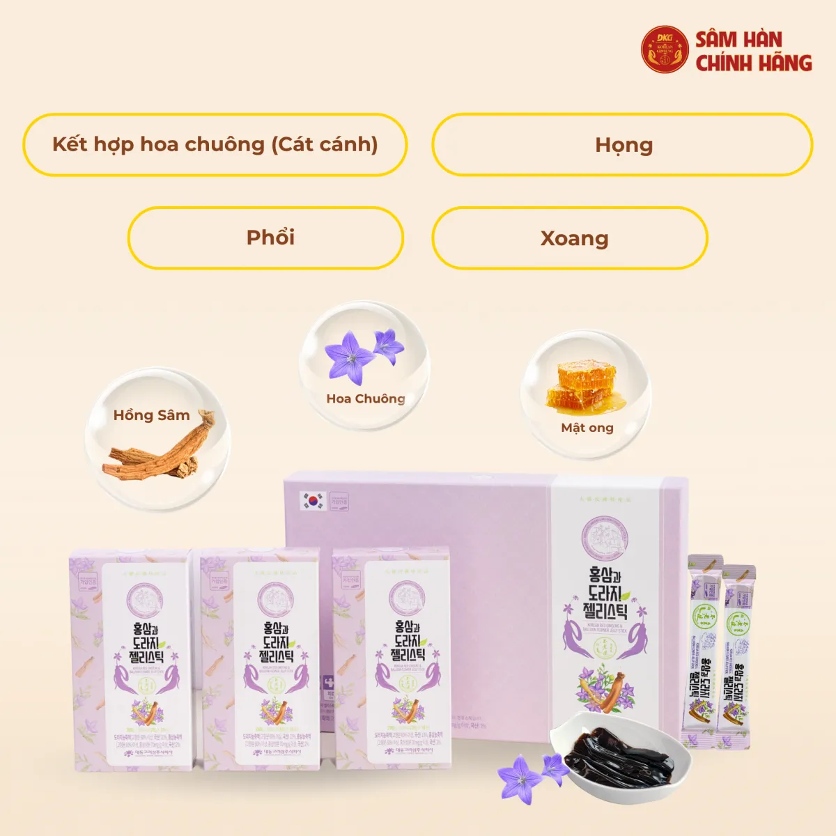 Thạch Hồng Sâm Hoa Chuông Daedong 20g x 30 gói (Korean Red Ginseng & Balloon Flower Jelly Stick) là món quà sức khỏe tiện lợi đến từ Daedong Korea Ginseng Co., Ltd. – Hàn Quốc.