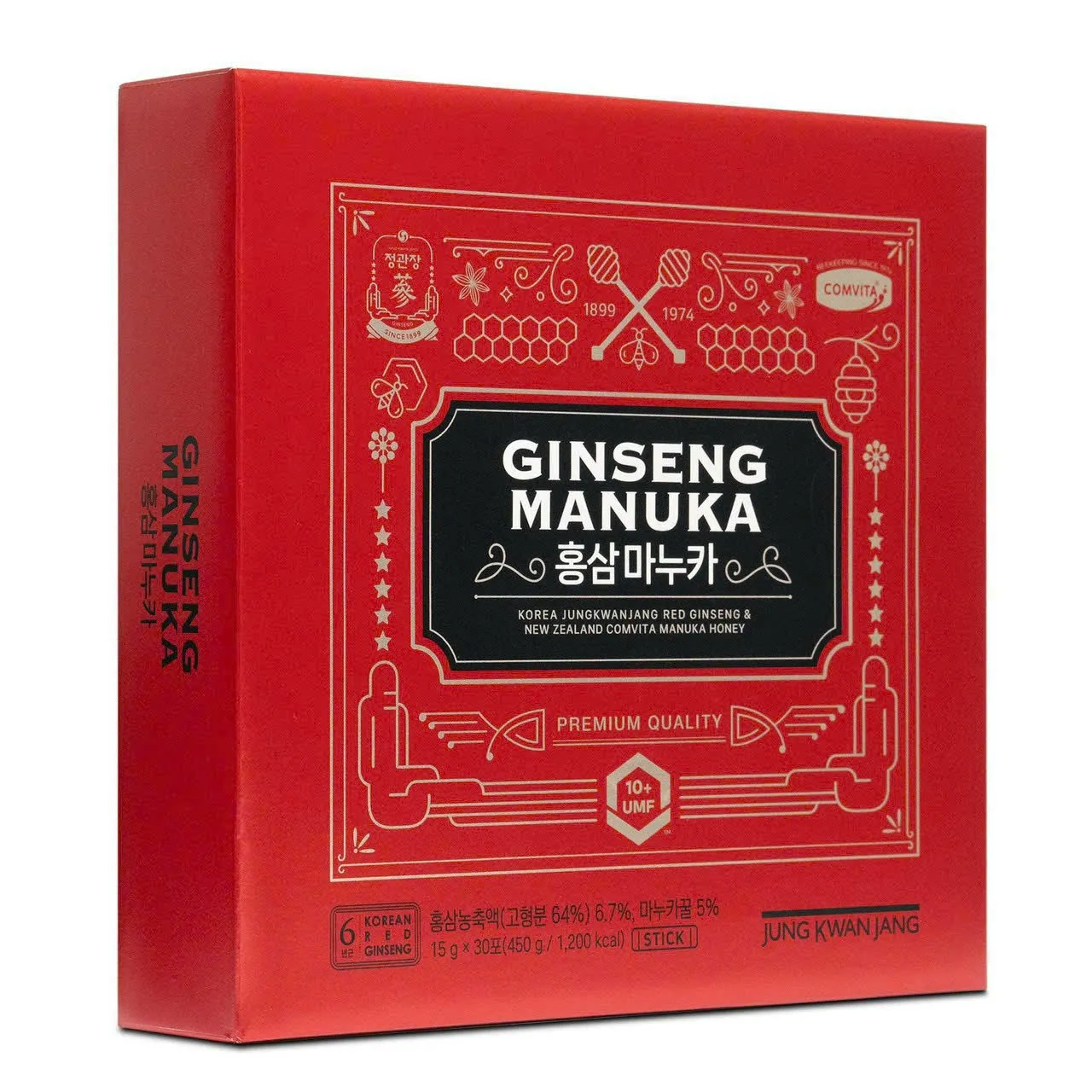 Tinh Chất Nước Hồng Sâm Mật Ong Manuka KGC Jung Kwan Jang 30 Gói được tập đoàn nhân sâm chính phủ cho ra đời từ cuối năm 2023 với những nguyên liệu chính như hồng sâm 6 năm tuổi Hàn Quốc kết hợp mật ong Manuka nguyên chất 100% được nhập khẩu từ New Zealand được lấy từ loài hoa Manuka nổi tiếng của New Zealand chuẩn UMF 10+ với và một số thành phần thảo dược khác từ thiên nhiên.