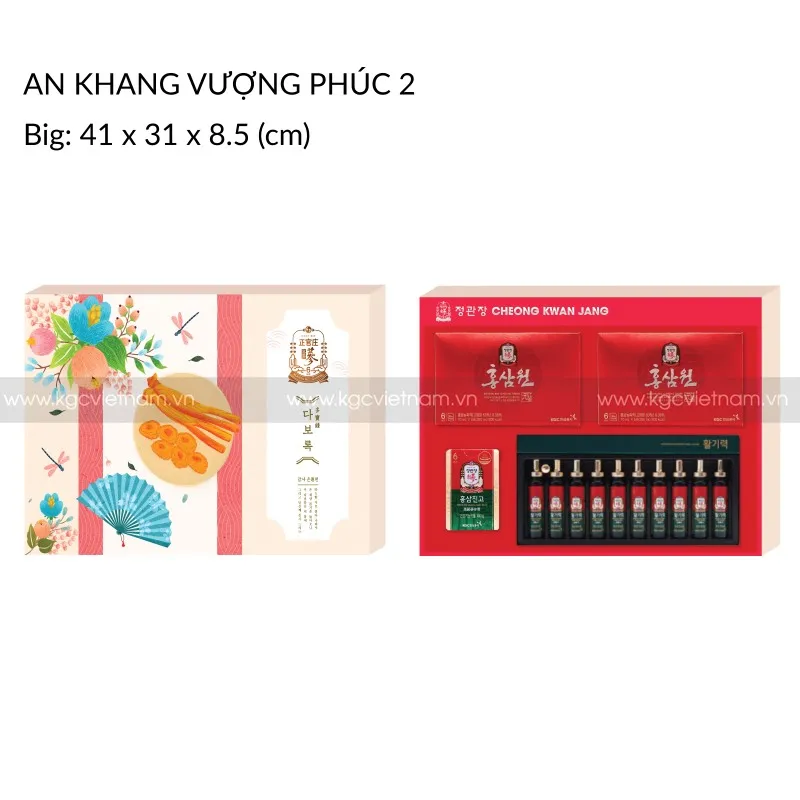 Hộp Quà Tặng Hồng Sâm Cao Cấp KGC AN KHANG VƯỢNG PHÚC 2 với ý nghĩa mong muốn người được tặng năm mới gia đình hạnh phúc và mạnh khỏe trong năm mới. Hộp quà tặng hồng sâm cao cấp Jung Kwan Jang - KGC với thiết kế trang trọng và tinh tế và bắt mắt.