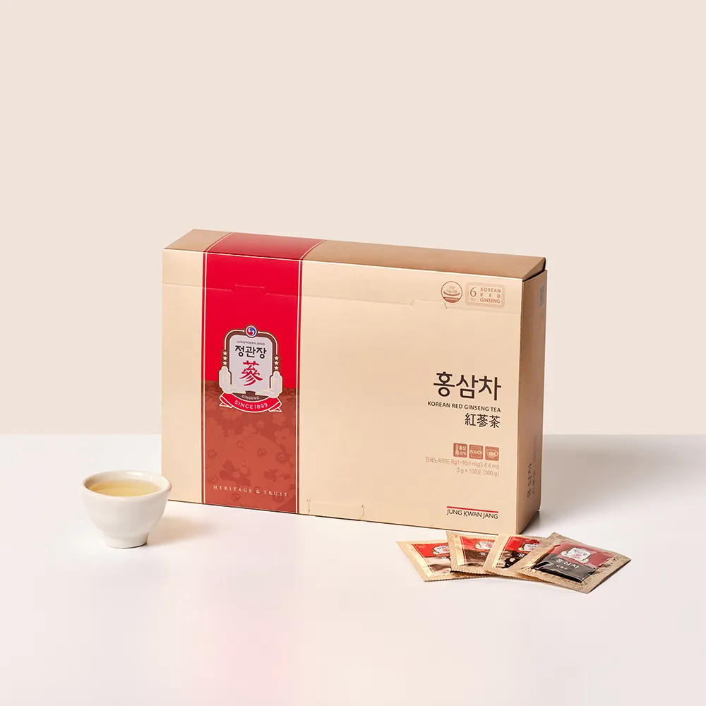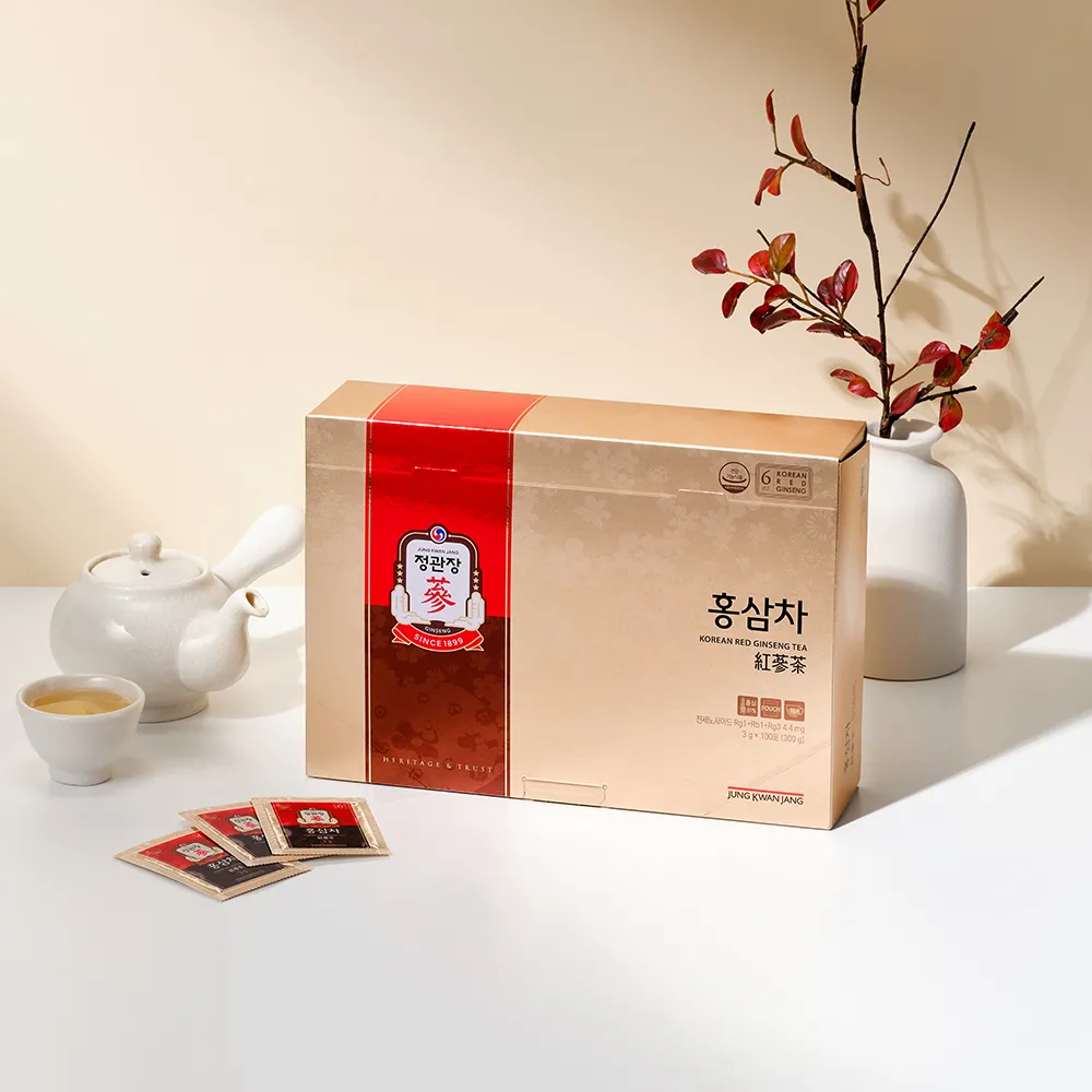 Trà Hồng Sâm KGC Jung Kwan Jang 3g x 100 Gói được sản xuất bởi tập đoàn hồng sâm chính phủ KGC Jung Kwan Jang, thương hiệu hồng sâm nổi tiếng được bảo hộ bởi chính phủ Hàn Quốc. Trà hồng sâm KGC Jung Kwan Jang giúp giải nhiệt và tăng cường sự tỉnh táo cho những ngày bận rộn, giảm căng thẳng mệt mỏi. Mỗi ngày tận hưởng một ly trà hồng sâm KGC với hương thơm dịu nhẹ cùng bạn bè, đồng nghiệp và gia đình thì còn gì bằng. Trà hồng sâm còn làm món quà tặng sức khỏe cho tất cả mọi người hay dễ dàng mang theo bên mình khi đi du lịch, đi chơi...