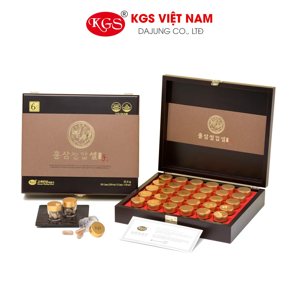 Viên hồng sâm G3 KGS Hàn Quốc hộp gỗ 90 viên được chiết xuất từ Hồng Sâm Hàn Quốc 6 năm tuổi với thành phần Rg1, Rb1 và Rg3 là 10mg/g giúp bồi bổ và tăng cường sức đề kháng cho người bị ung thư, người già, người lao động quá sức, giúp lưu thông khí huyết, nâng cao sinh lực, giảm mệt mỏi, căng thẳng, stress, là món quà biếu, quà tặng sức khỏe cho mọi người.